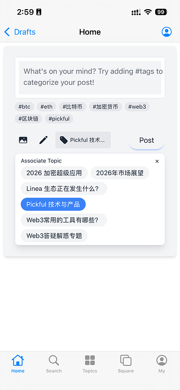 The post toolbar now features a tag icon for topic selection. Tap it to reveal a topic panel with pill-style buttons. The selected topic name appears next to the icon — tap the same topic again to deselect. When no topic is selected, only a subtle icon is shown, keeping the interface clean for users who don't use topics.