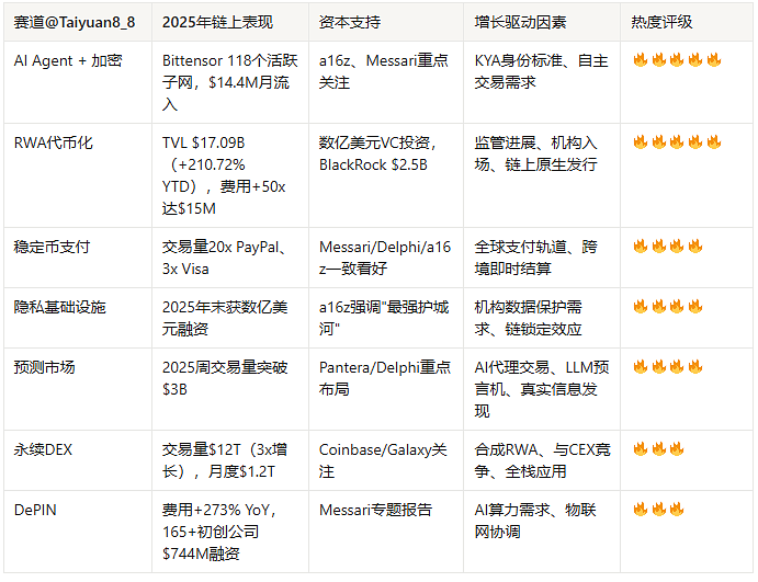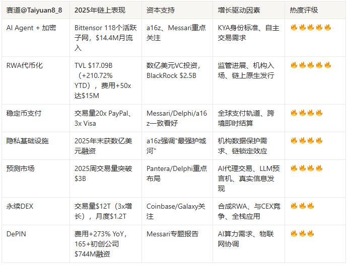 这些赛道的共同特征是:(1)已展现可验证的链上增长指标或费用收入;(2)获得主流VC和机构资本支持;(3)受益于监管明确化和技术成熟度提升;(4)与AI、TradFi等宏观趋势深度融合。从实用性转向而非纯粹投机,标志着Web3进入价值创造的新阶段。