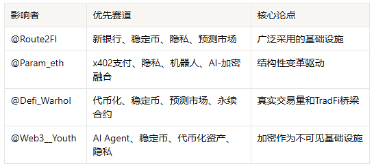 整体情绪倾向:看涨为主,强调成熟度和实际效用而非过往炒作周期;对机构采用和监管进展持积极态度;对memecoin和GameFi等过度炒作领域持怀疑,倾向基础设施优先。
