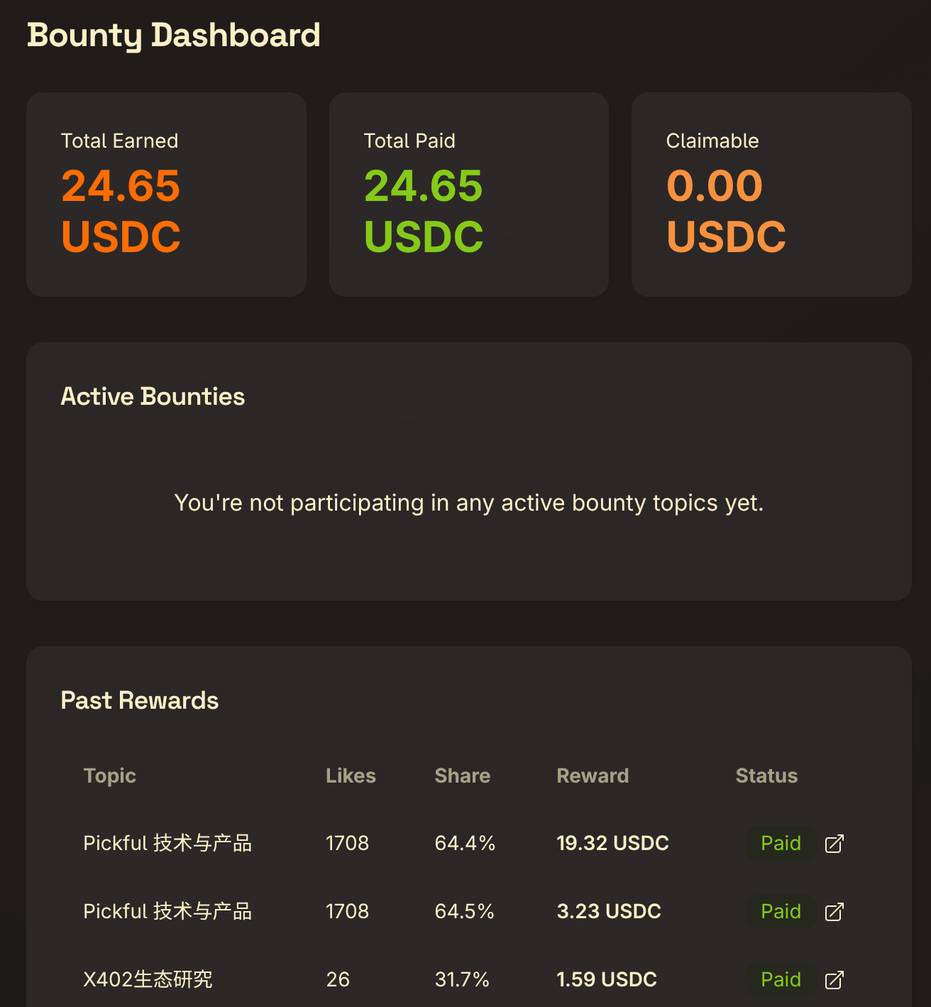 - Past Rewards: All settled bounty records with on-chain transaction links