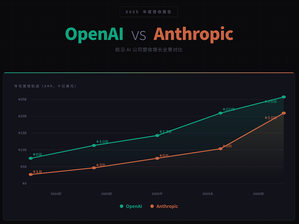 2025年,OpenAI 和 Anthropic 这两家前沿AI公司的收入呈现出爆炸式增长,成为AI行业最引人注目的现象之一。两家公司都凭借大模型产品的快速商业化,实现了营收规模的指数级跃升,但OpenAI 仍然保持领先,而Anthropic 的追赶速度极快,几乎在2025年底到2026年初将差距大幅缩小。