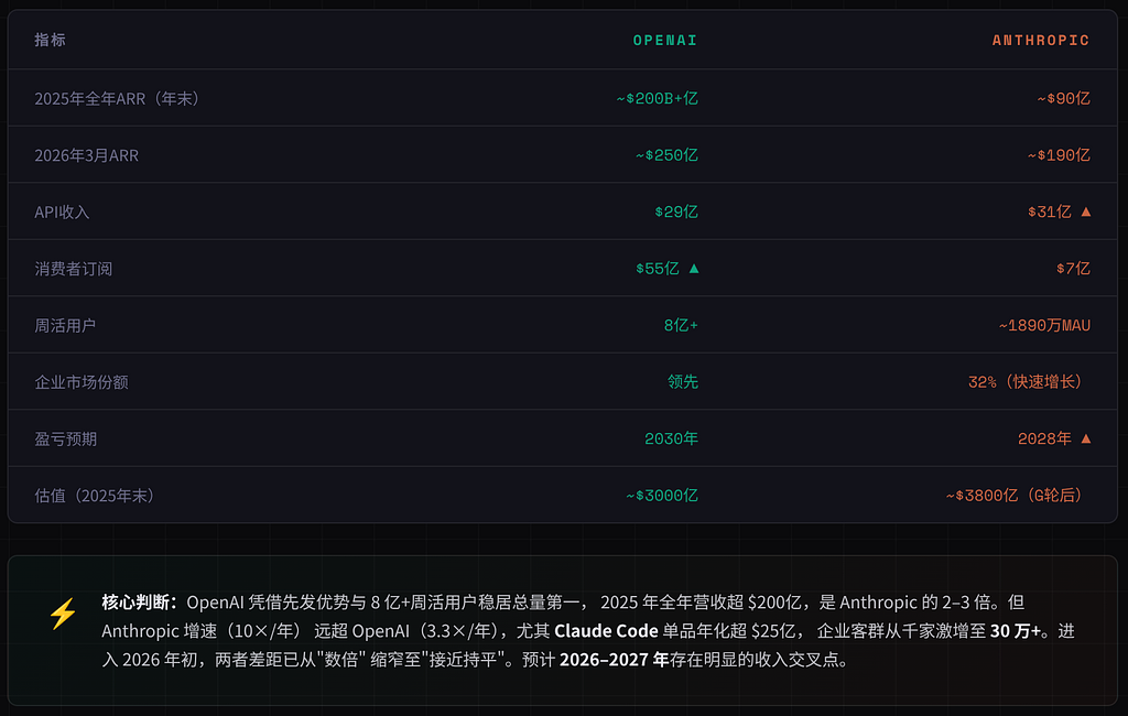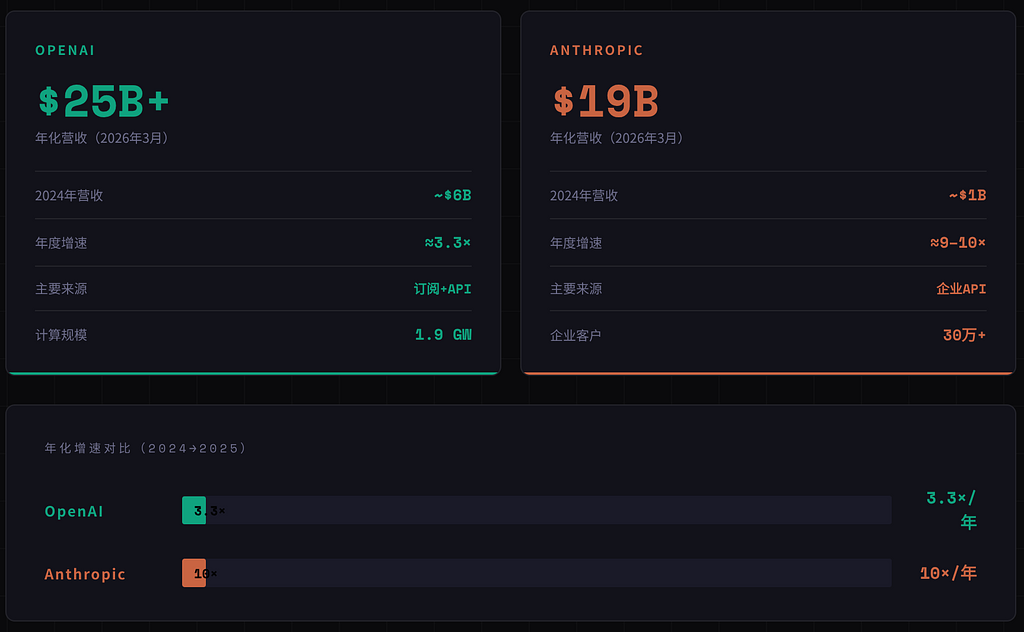2025年OpenAI年化收入从60亿跃升至超200亿,增长约3.3倍;Anthropic从数十亿飙升至年末约90亿、2026年初接近200亿,增速远超对手,企业端尤其是Claude Code贡献巨大,差距快速缩小。