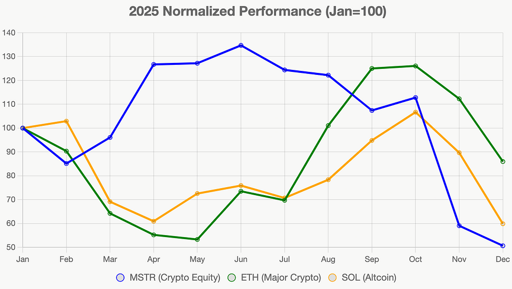 为了生动展示,让我们看一张2025年规范化表现图表(1月设为100),比较加密股权(MSTR)、主流币(ETH)和altcoin(SOL)。图中可见,MSTR虽波动大,但整体轨迹反映机构支撑;SOL作为altcoin代表,表现更碎片化。